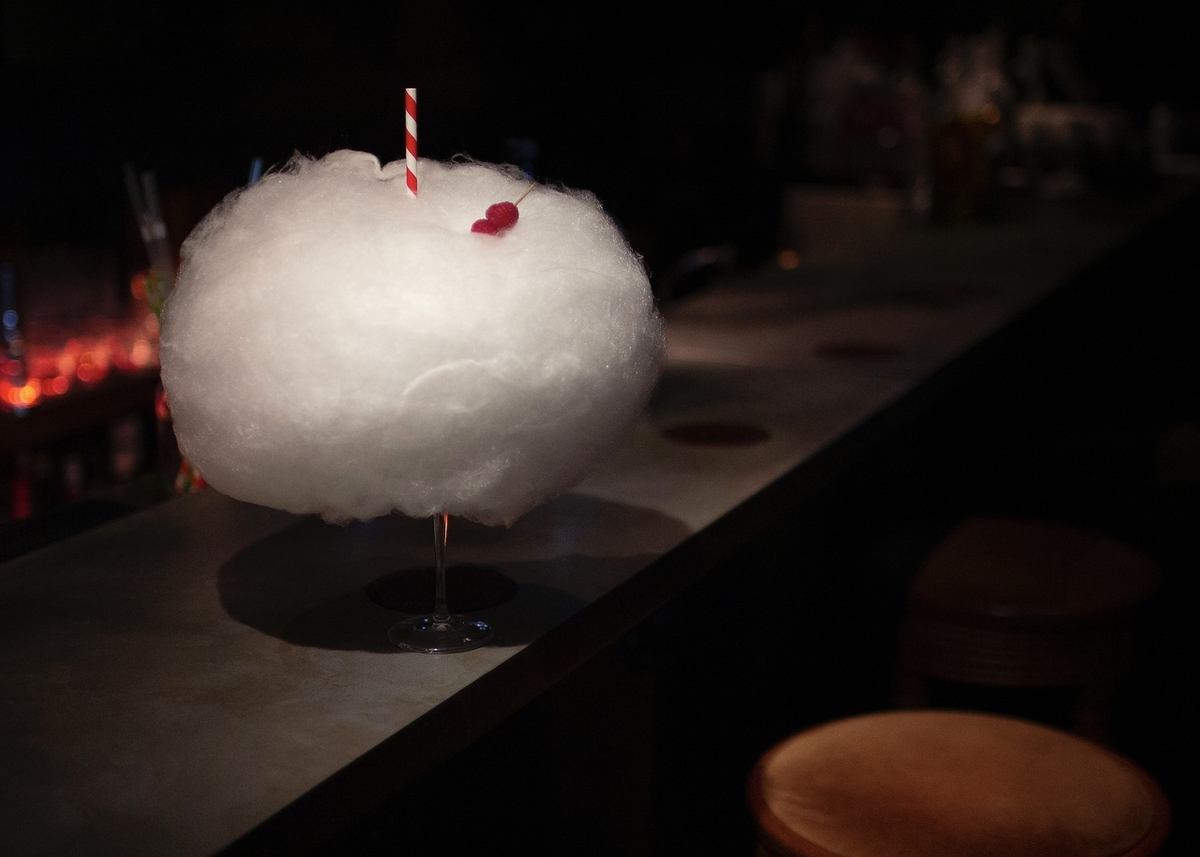 グラスに綿あめをまきつけ、自家製のラズベリーシロップやラムで作ったカクテルを上から注ぎ入れて完成する当店の名物カクテルです。